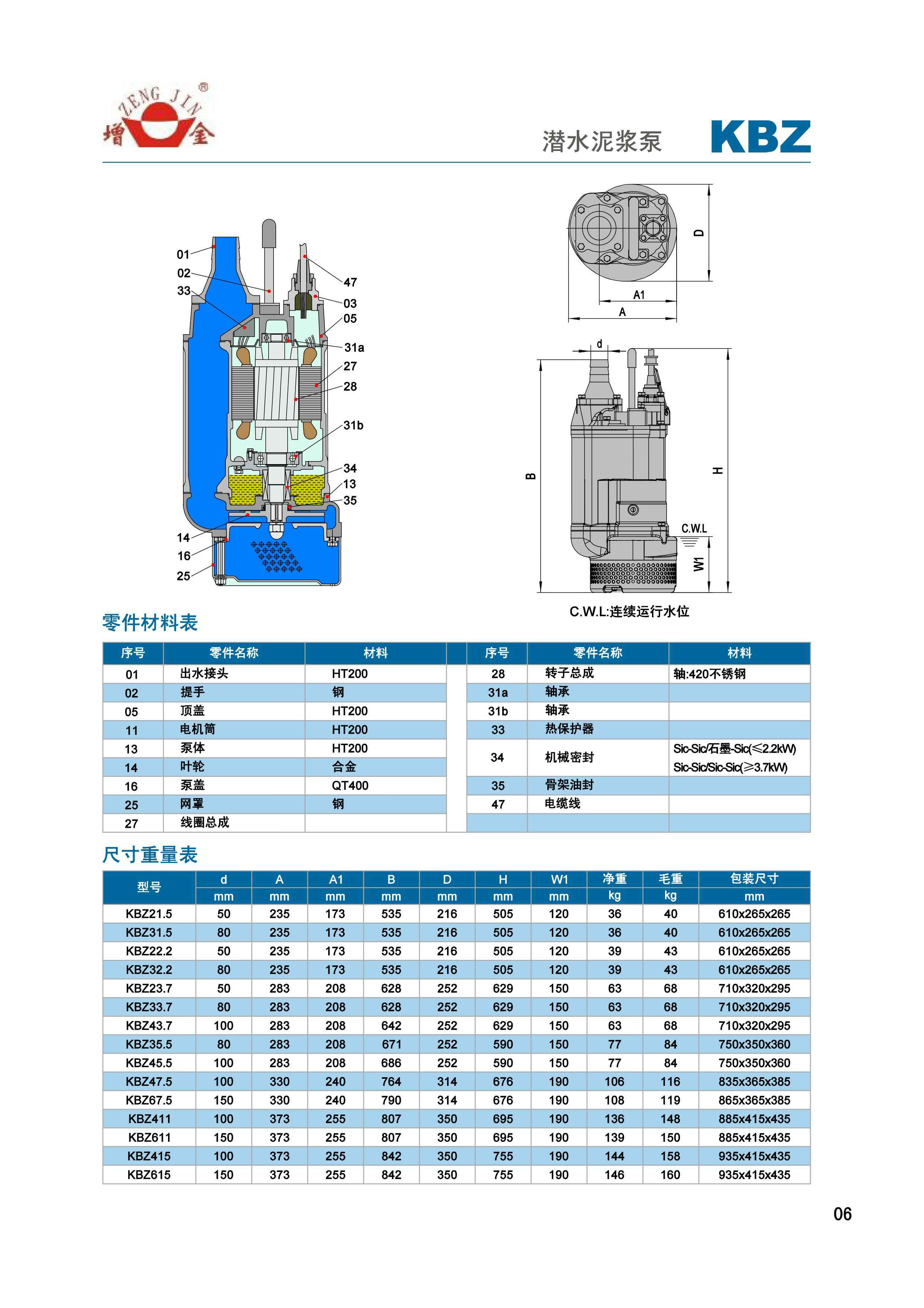 KBZ潜水泥浆泵为下式泵,上出水设计,电机筒侧为整体铸造的出水通道。半内装式,结构紧凑,冷却效果好,可以露出水面运行。特殊机械密封结构保证了较高的潜水承压和恶劣工况环境。半开式叶轮采用耐磨合金铸造,具有优异的耐久性。出水口可以竖向安装也可倾斜向安装,方便使用。全系列采用铸铁机身。功率≤11kW配有内置热保护器。